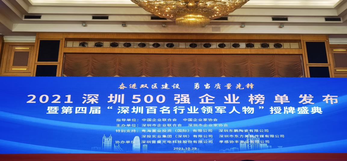 10月29日,由中國企業(yè)聯(lián)合會、中國企業(yè)家協(xié)會指導(dǎo),深圳市政府相關(guān)部門支持,深圳市企業(yè)聯(lián)合會、深圳市企業(yè)家協(xié)會等主辦的“奮進(jìn)雙區(qū)建設(shè) 勇當(dāng)質(zhì)量先鋒”2021深圳500強企業(yè)發(fā)布暨第四屆“深圳百名行業(yè)領(lǐng)軍人物”頒獎盛典在深圳五洲賓館隆重舉行。