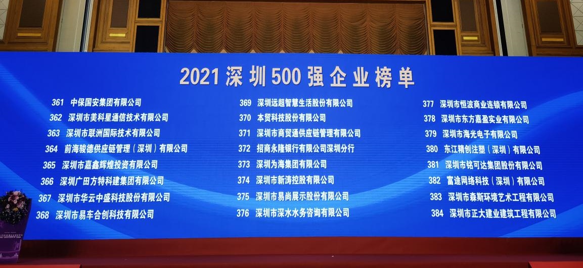正大建業(yè)公司連續(xù)二年榮登“深圳企業(yè)500強”榜單,以營收9.62億元,排名2021年深圳500強企業(yè)榜單384位,較2020年排名提升50位。